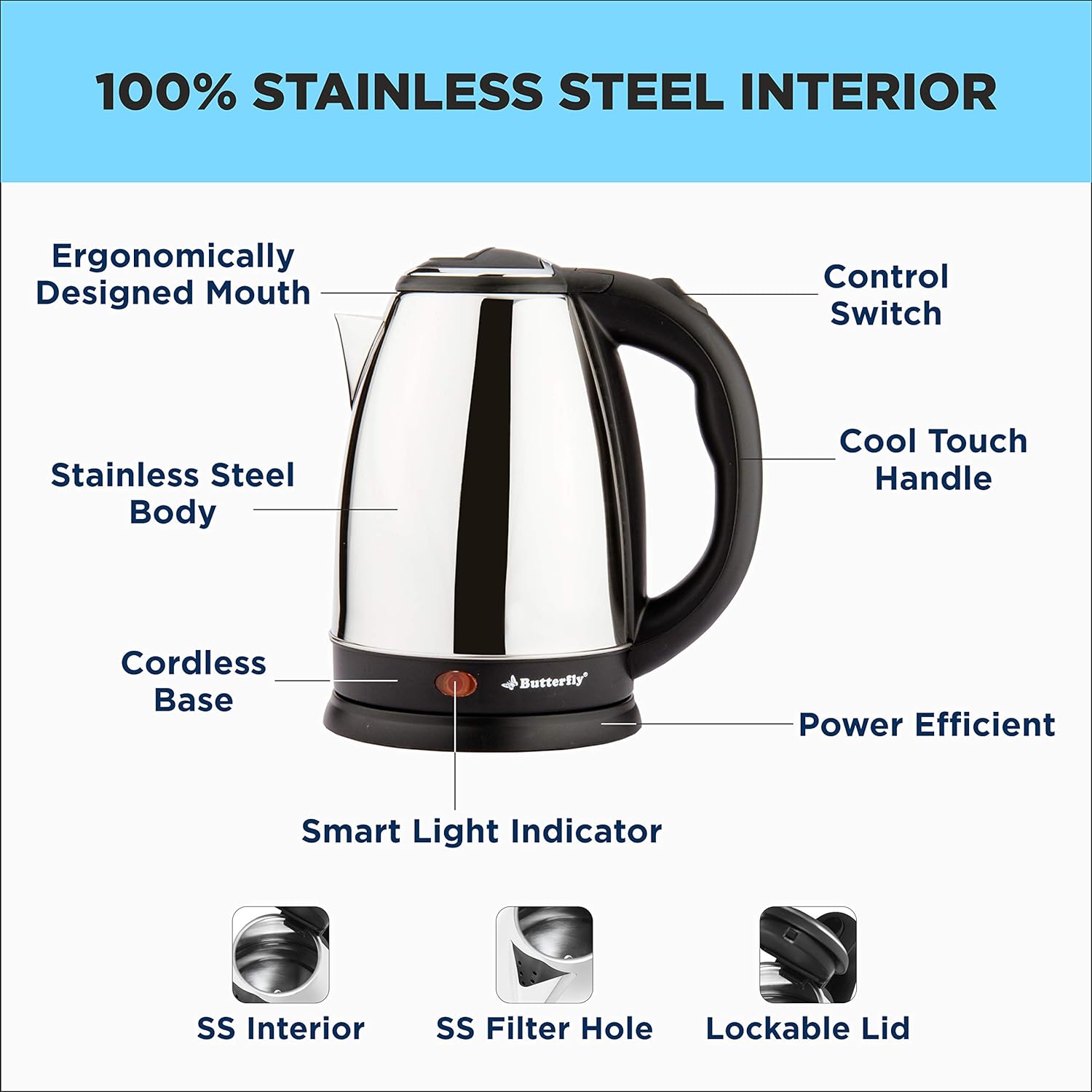 Prepare hot water, instant tea, etc. in a matter of minutes with Butterfly EKN 1.8 liters Kettle. With attractive features like automatic cut-off, ergonomically designed handles, and unique designs with attractive finishes, lightweight and compact, making it easy to carry. To top it off, it also comes with the best-in-class safety features, making it safe to use. Butterfly Water kettle comes with 1500 watts and a one-year warranty. It will quickly heat and lasts the heat of the water for a long.
